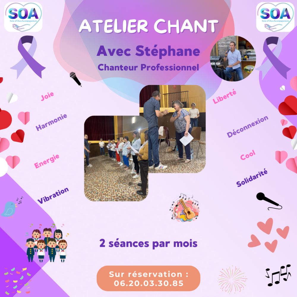 Grâce à ce nouvel atelier, Stéphane, chanteur professionnel souhaite partager son temps et ses émotions entre patients et aidants, réunis par l’amour de la musique. Les séances sont ouvertes à tous les adhérents de la SOA, sans nécessiter de compétences particulières en technique vocale. 🎤✨