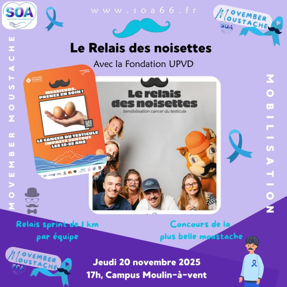 - 🏃♂️ À 18h : Prenez part au Relais des Noisettes, une course symbolique et solidaire ouverte aux étudiants et personnels de l’UPVD (et à l’équipe SOA). Une occasion de se mobiliser pour une cause essentielle tout en partageant