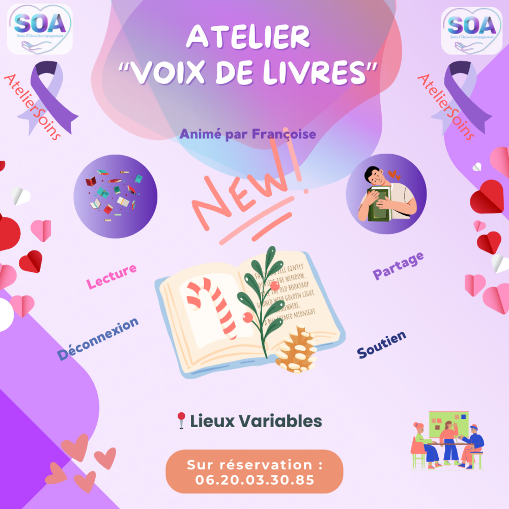 La SOA est heureuse d’annoncer la création d’un tout nouvel atelier : le Cercle de Lecture, initié par notre adhérente Françoise 💕. Cet atelier est né de son envie de partager et de célébrer tout ce que la SOA lui a apporté, à travers un espace convivial et bienveillant autour des livres.