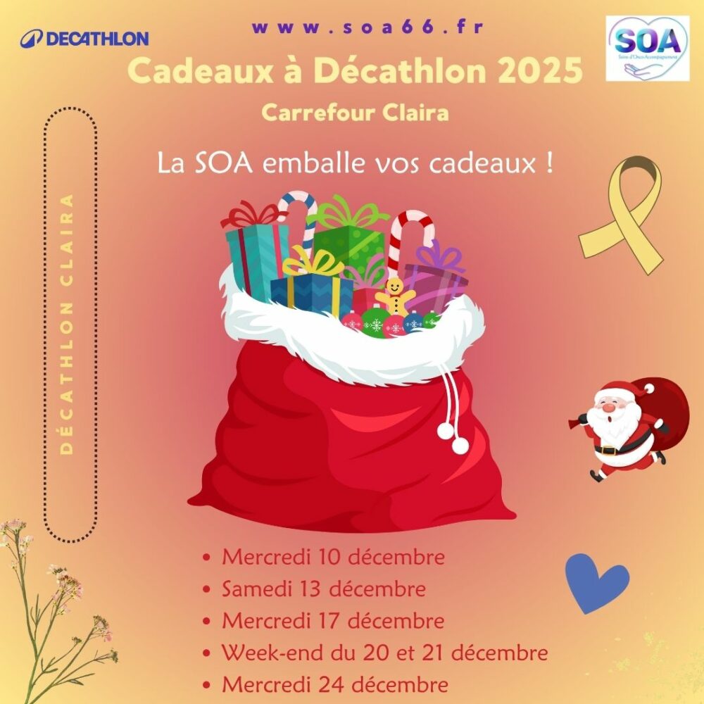 Cette année encore, l’association SOA se mobilise pour Noël avec une belle initiative : emballer les cadeaux des clients de Décathlon à Claira et reverser les fonds récoltés à notre cause. Grâce à cette action, nous pourrons continuer à accompagner et soutenir nos patients et aidants.
