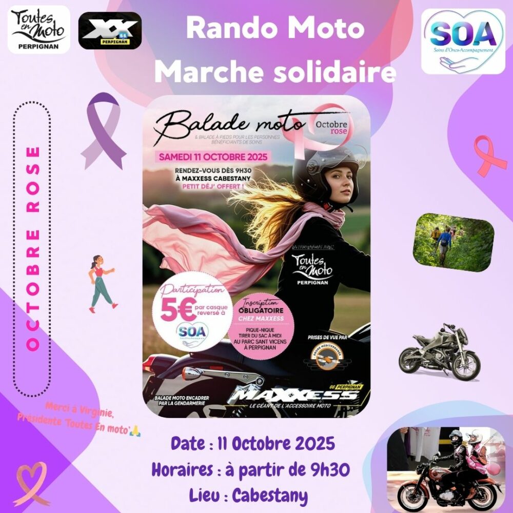 Dans le cadre d’Octobre Rose, mois de sensibilisation à la lutte contre le cancer du sein, la SOA, l’Association « Toutes en moto » et le magasin « Maxxess » vous donnent rendez-vous pour une journée solidaire, conviviale et pleine d’énergie !