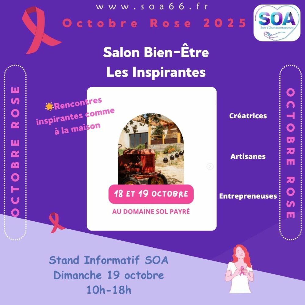 Dans le cadre d’Octobre Rose 2025, la SOA sera présente au Salon Bien-Être Les Inspirantes, qui se tiendra les 18 et 19 octobre au Domaine Sol Payré à Elne.